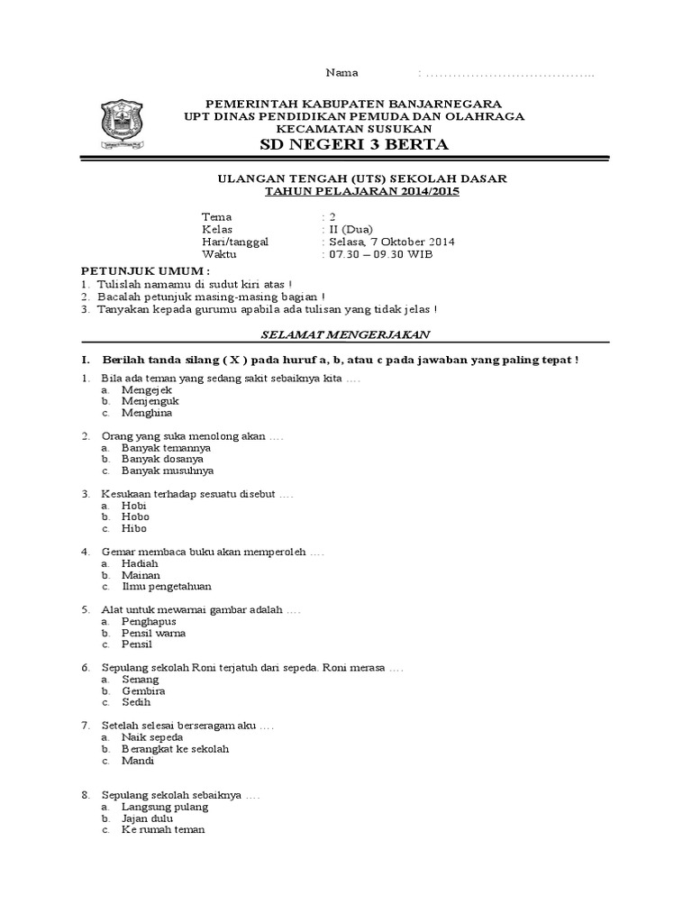 Soal Uts Kelas 2 Semester 1 Tema 2