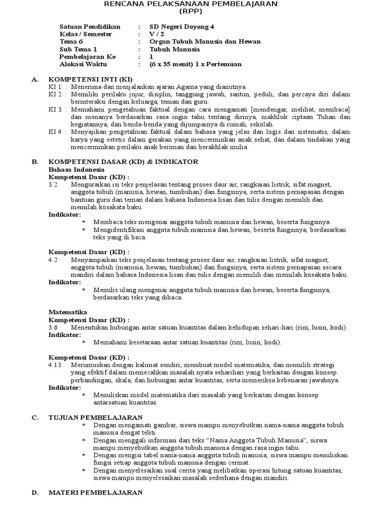 250112473 Rpp Sd Kelas 5 Semester 2 Organ Tubuh Manusia Dan